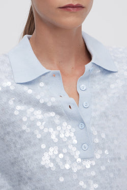 Pull à polo en maille de laine et cachemire, entièrement brodé de paillettes transparents effet mouillé. Coupe ajustée.