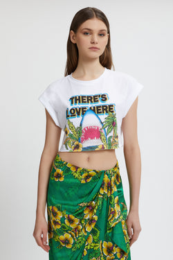 T-shirt court imprimé requin et cristaux. Les manches ont un petit revers.