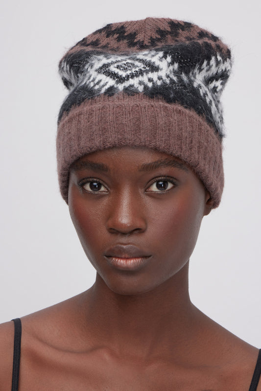 CAPPELLO IN MAGLIA JACQUARD CON MOTIVO A ROMBI E CRISTALLI