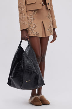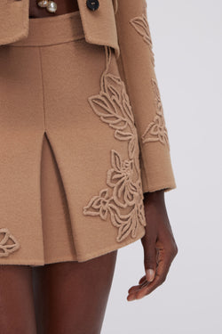 Minigonna in double di lana con piega al centro davanti e preziosi ricami in lana in tono. Sfoderata, zip sul fianco.