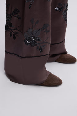 Pantaloni modello pigiama flare di raso in sbieco con fiori ricamati di paillettes nere in contrasto. Bordo liscio al fondo conn piping nero. Baschina con passanti, tasche e zip nel fianco. Piega stirata