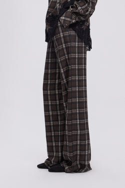 Pantaloni ampi in morbida flanella di viscosa fluida con stampa check. Piega davanti, cinturino con passanti e zip sul fianco.